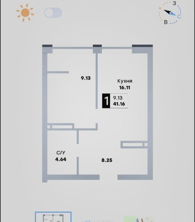 Однокoмнатная квaртиpа, общая площадь 41.16м 2